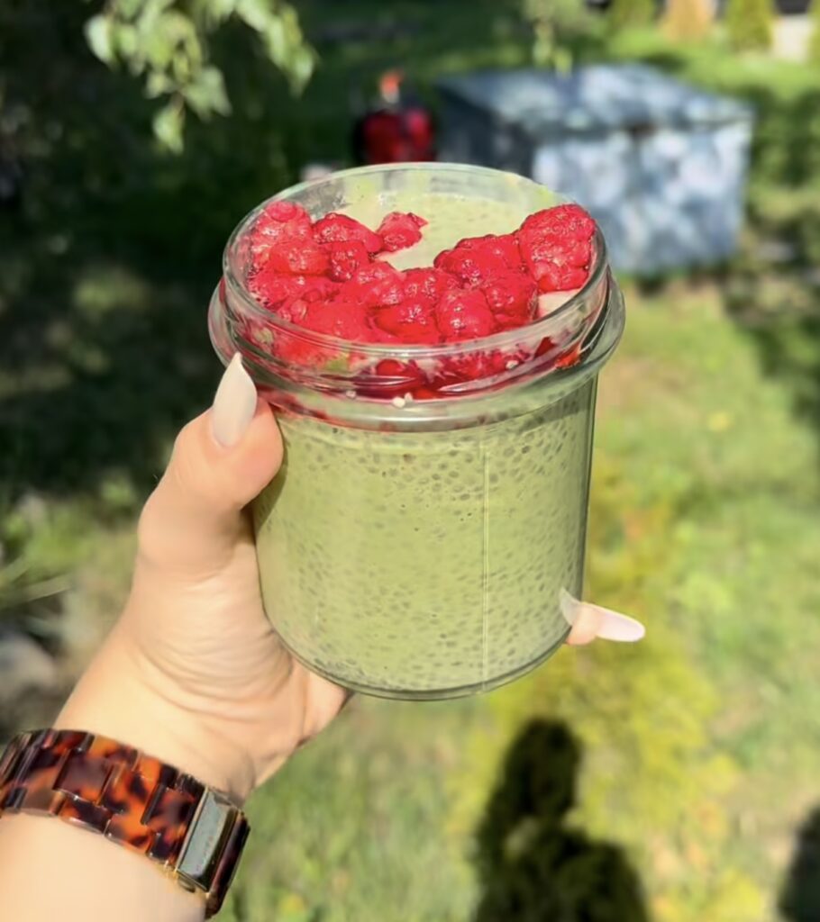 Cum se prepară: Amestecă laptele cu matcha, îndulcitorul și vanilia (opțional) într-un borcan. Adaugă semințele de chia, omogenizează bine și lasă totul la frigider minim 2 ore (sau peste noapte). Servește cu zmeură proaspătă