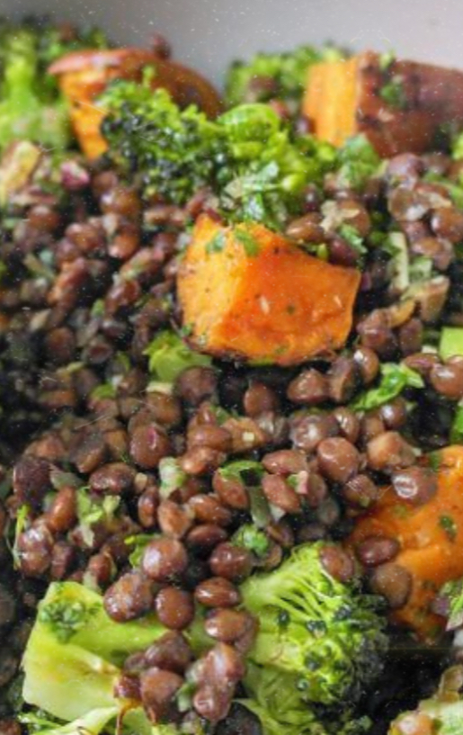 Cum se prepară: Taie cartoful dulce cuburi și broccoli în buchețele, condimenază-le și coace-le la 180°C timp de 20-25 de minute. La final, amestecă legumele coapte cu lintea fiartă și adaugă zeama de lămâie